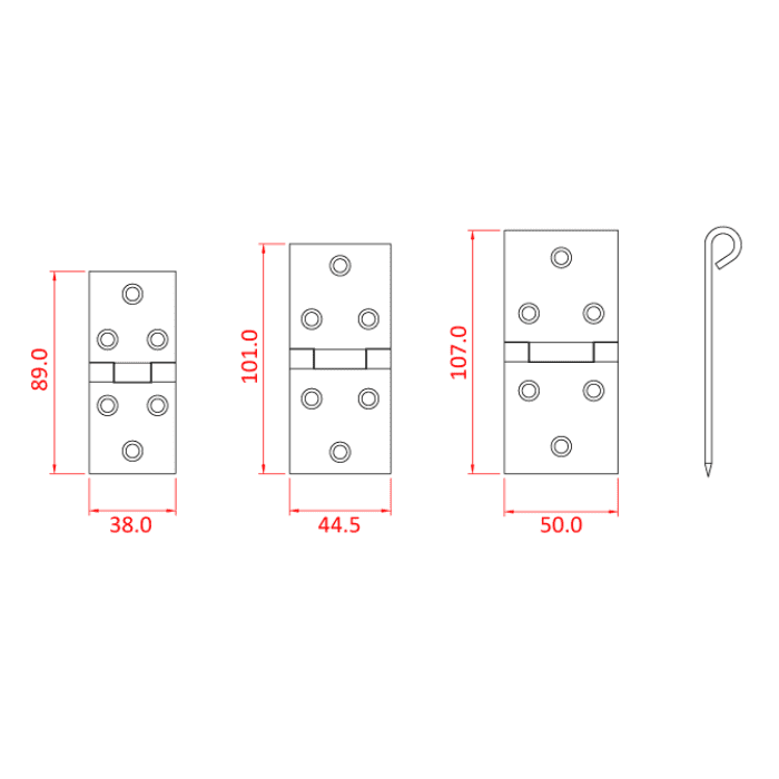 A range of mild steel loose pin hinges ideal for use in the construction of stage scenery. Available in three different sizes. Please note: Hinge pins (T62100) must be ordered separately.