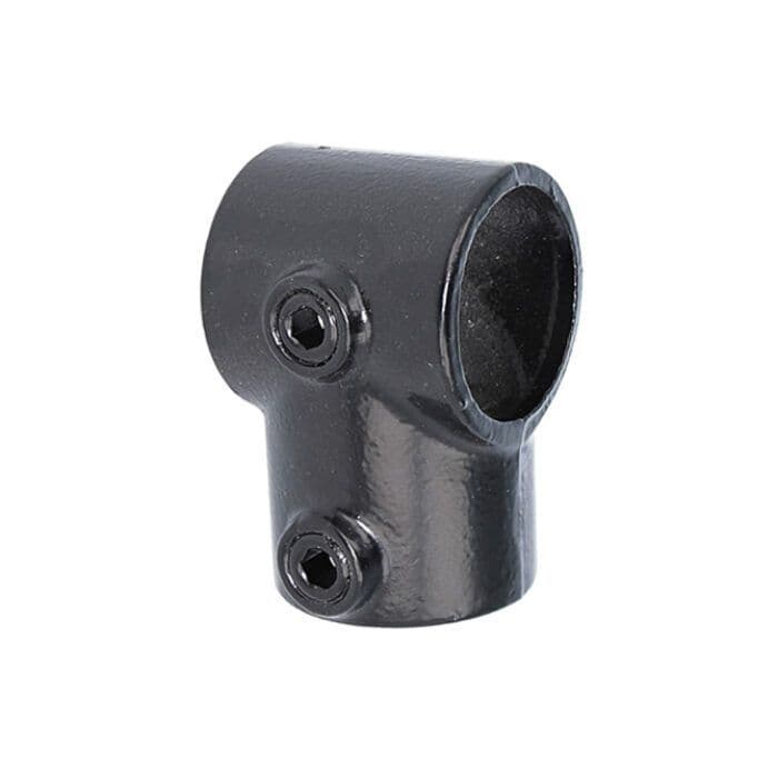 A galvanised steel fitting, designed to provide a 90 degree tee connection between two tubes.