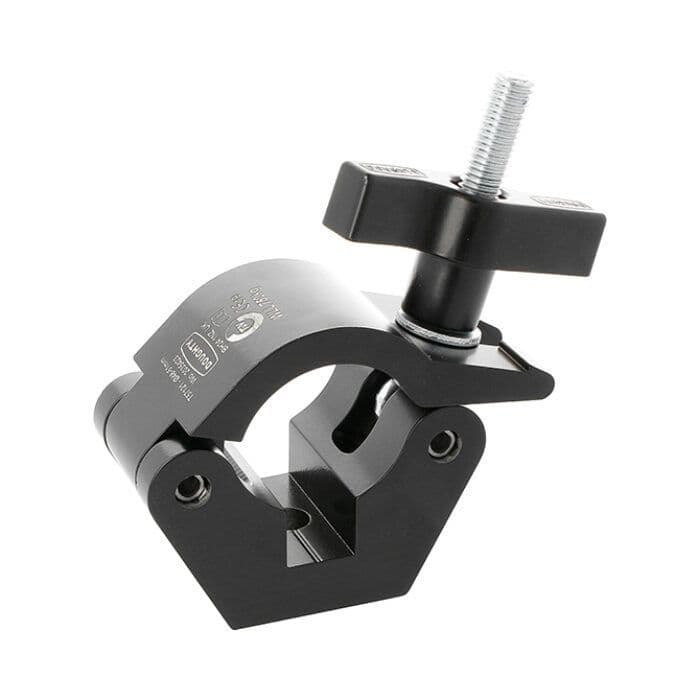 The industry standard half coupler with a large Easy Grip knob. A high tensile extruded aluminium clamp that is suitable for 48mm to 51mm (1.89” – 2.01”) diameter tubes designed to be used without the need for tools. It has a WLL of 750Kg and is 50mm (1.97″) wide. Slotted to hold captive an M12 nut or bolt head. Ideal for trussing as it will not damage the cords.